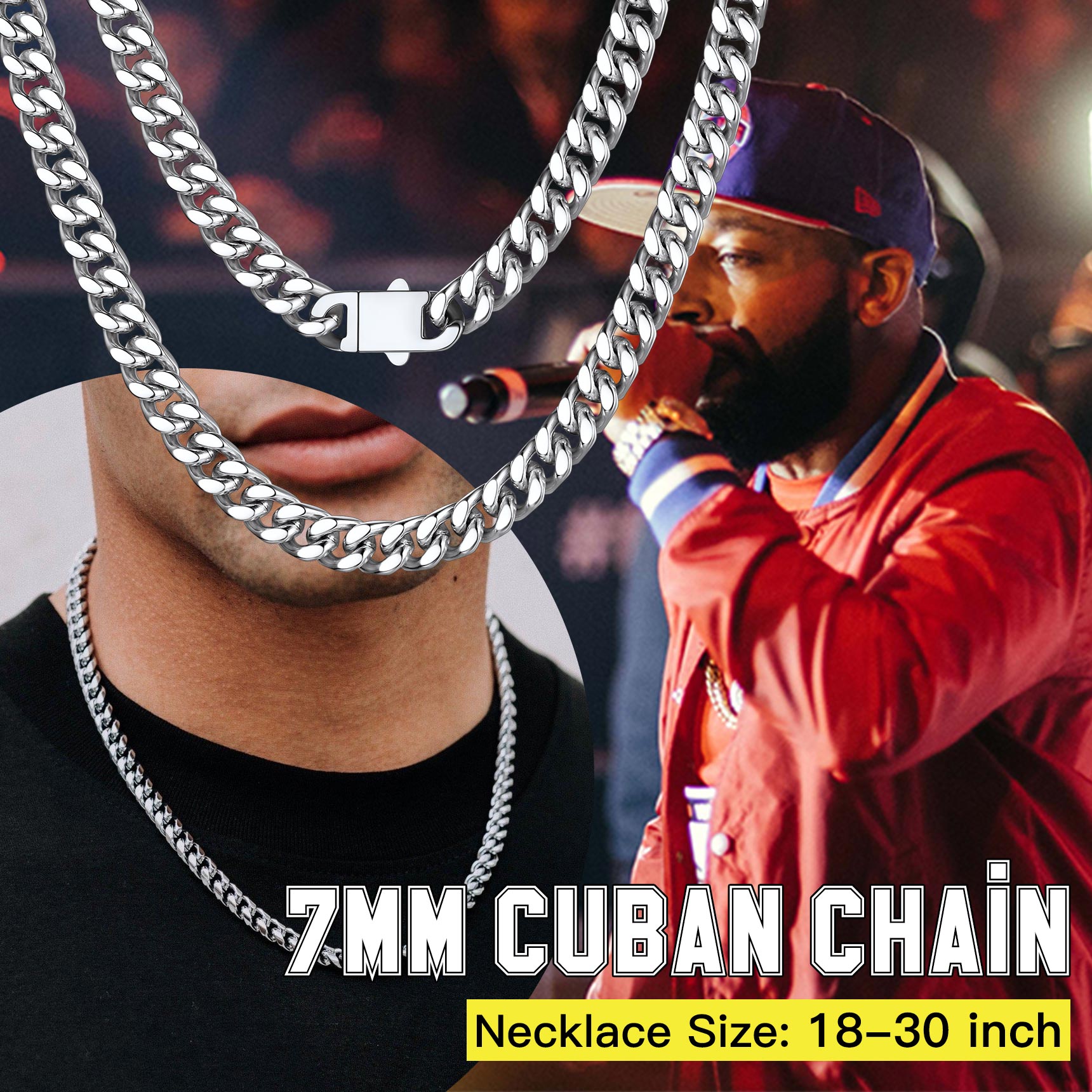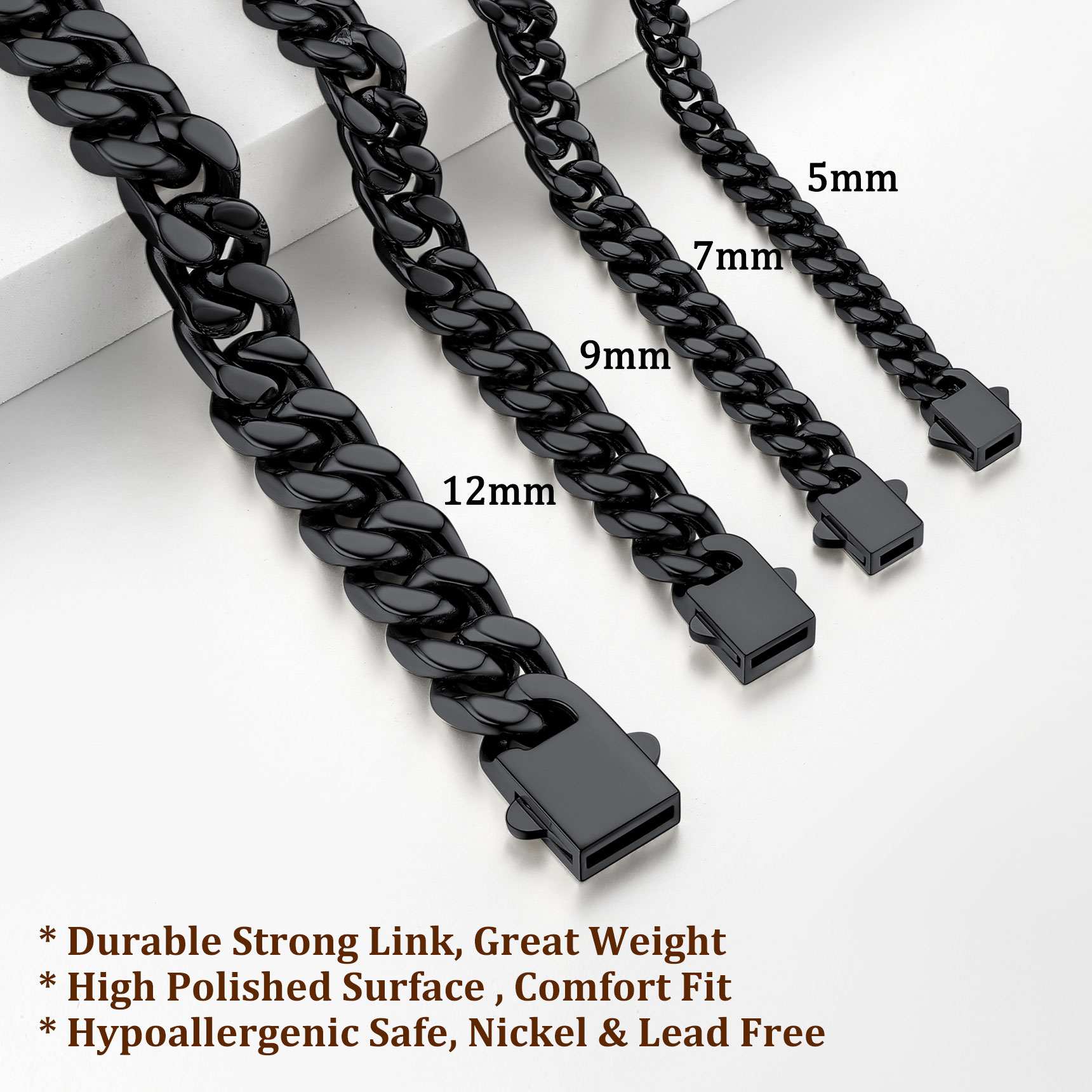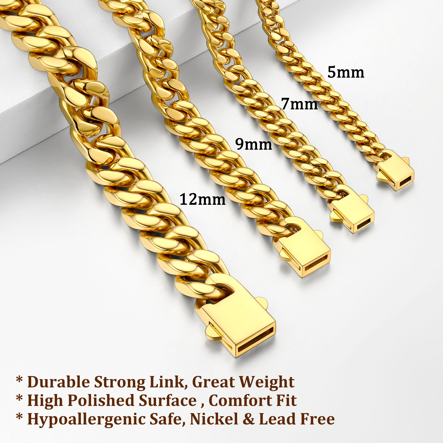 Chain Necklace for Men - For this Classic Sturdy Miami Cuban Chain, We offer 5mm 7mm 9mm 12mm Width, most selected chain wide. And length 18/20/22/24/26/28/30 inch is available. Choose the most suitable chain according to your style. Before you purchase any necklace, you should consider the length of the chain. The same chain in a different length can give a completely different vibe.