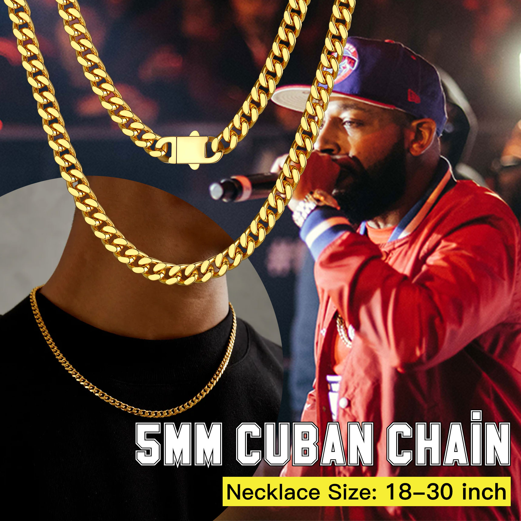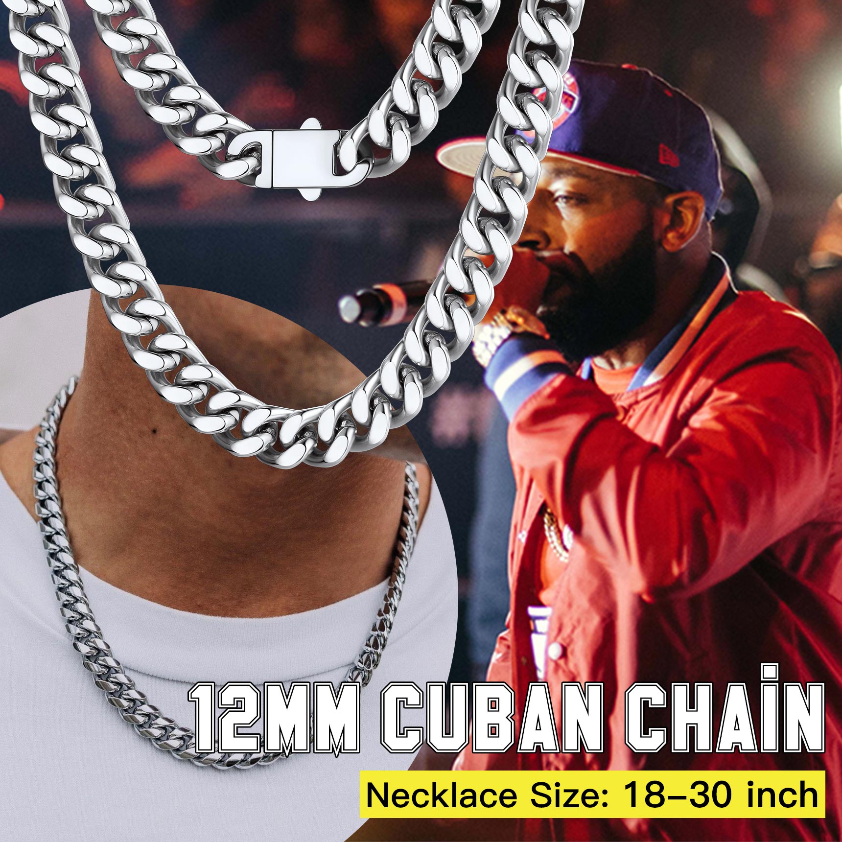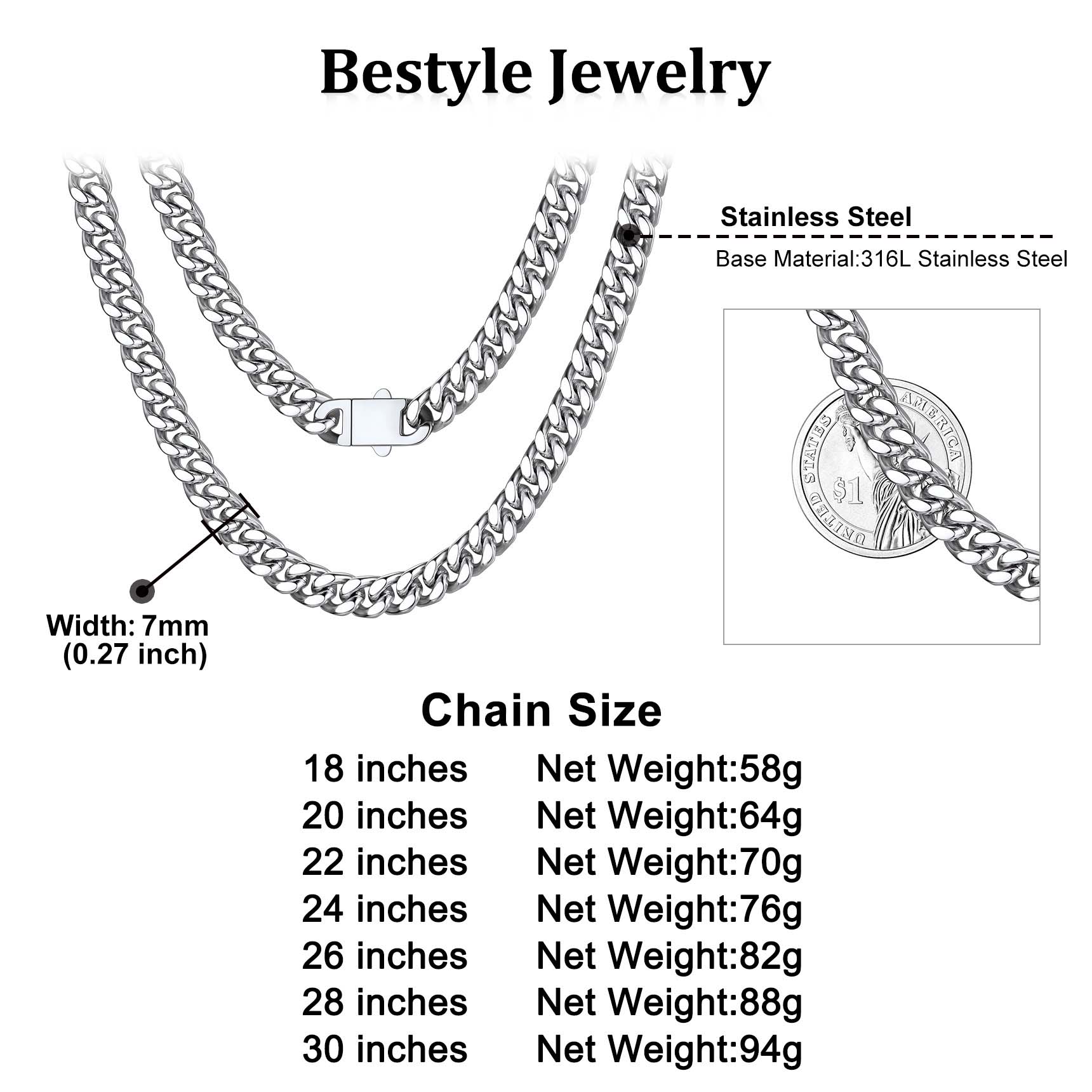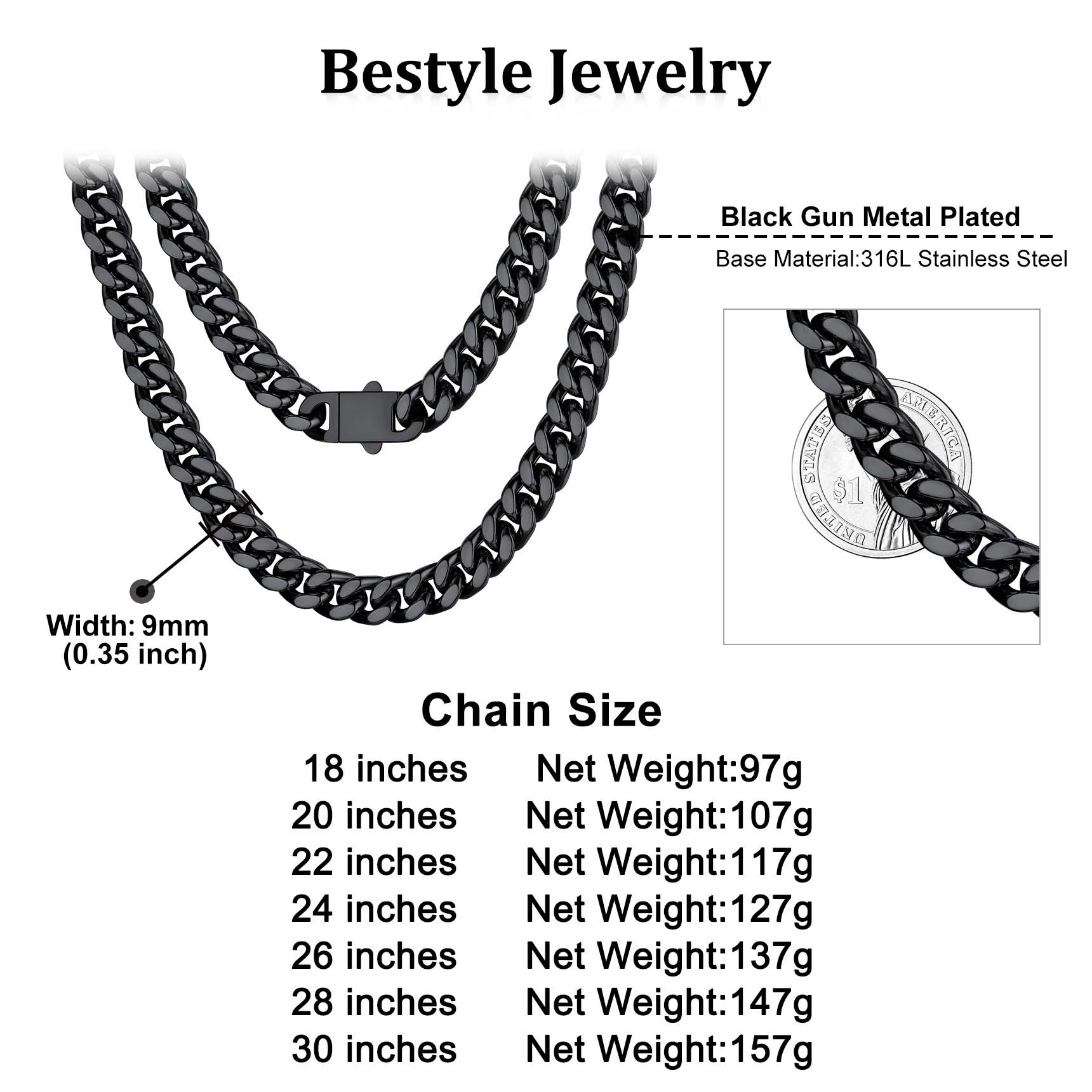 Chain Necklace for Men - For this Classic Sturdy Miami Cuban Chain, We offer 5mm 7mm 9mm 12mm Width, most selected chain wide. And length 18/20/22/24/26/28/30 inch is available. Choose the most suitable chain according to your style. Before you purchase any necklace, you should consider the length of the chain. The same chain in a different length can give a completely different vibe.