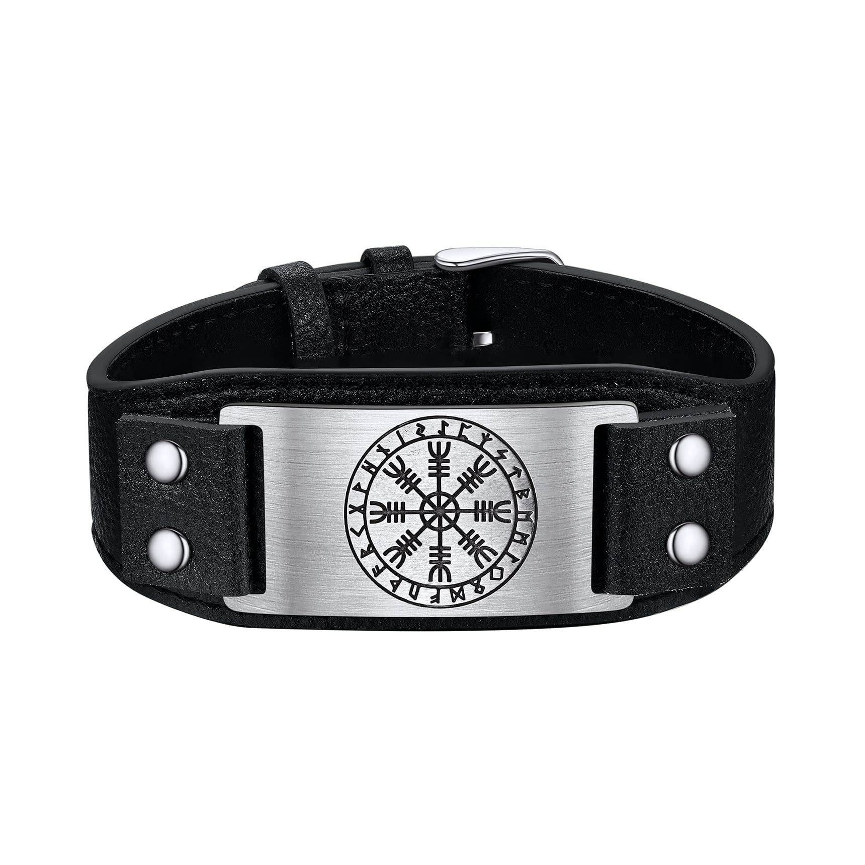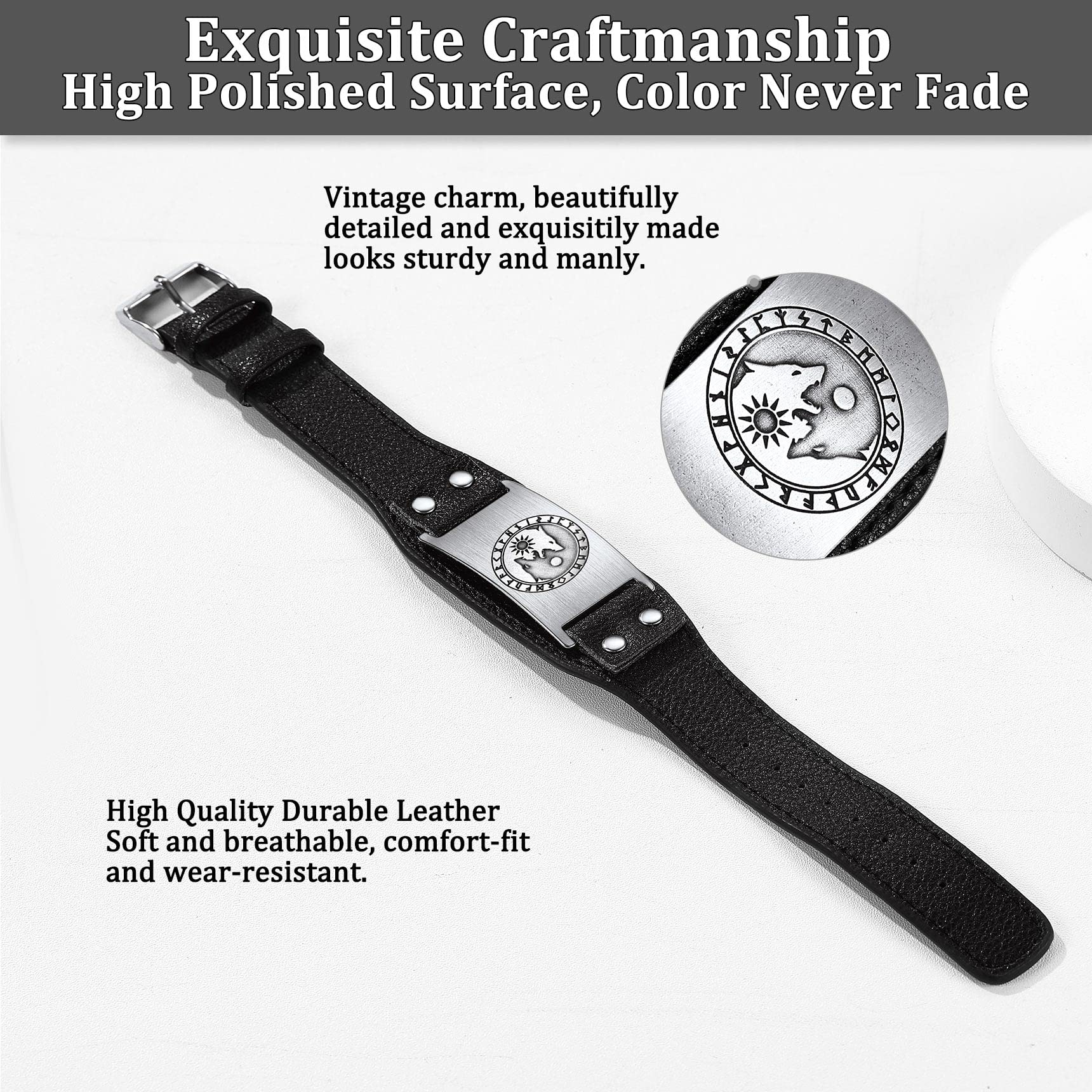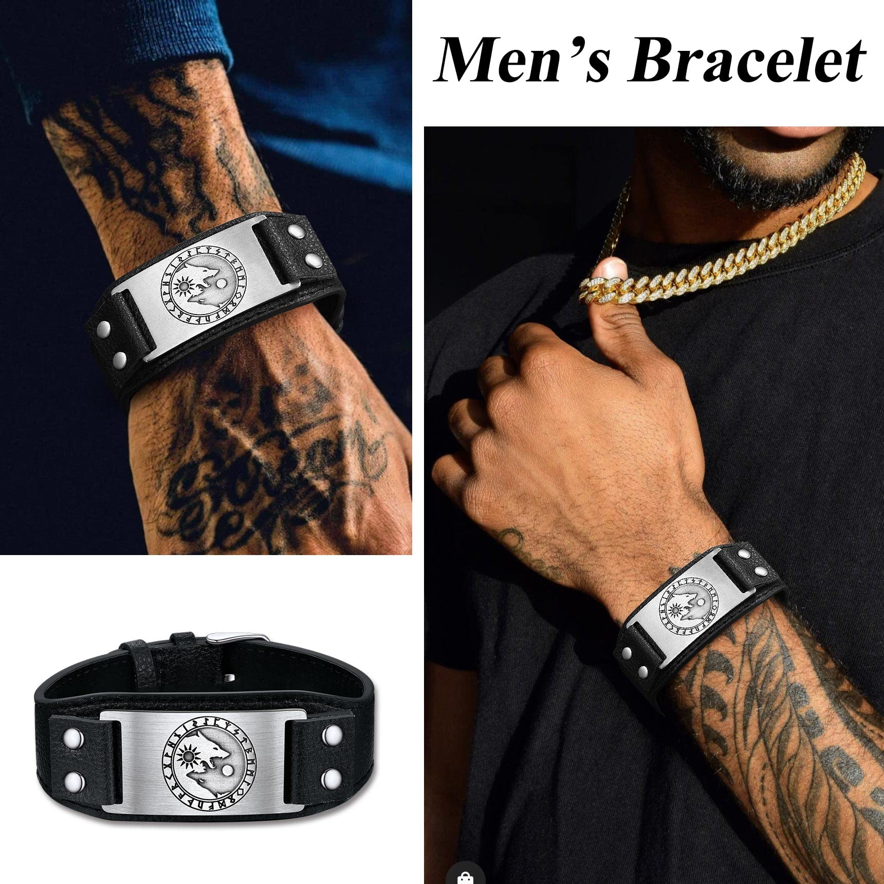 Black Viking Wristband with Wolf Chasing Sun Moon Engraved - This cool men bracelet is a good choice for a men or boys to wear an amulet and add them a sense of vintage and mysterious. It also can give them courage and comfort.
