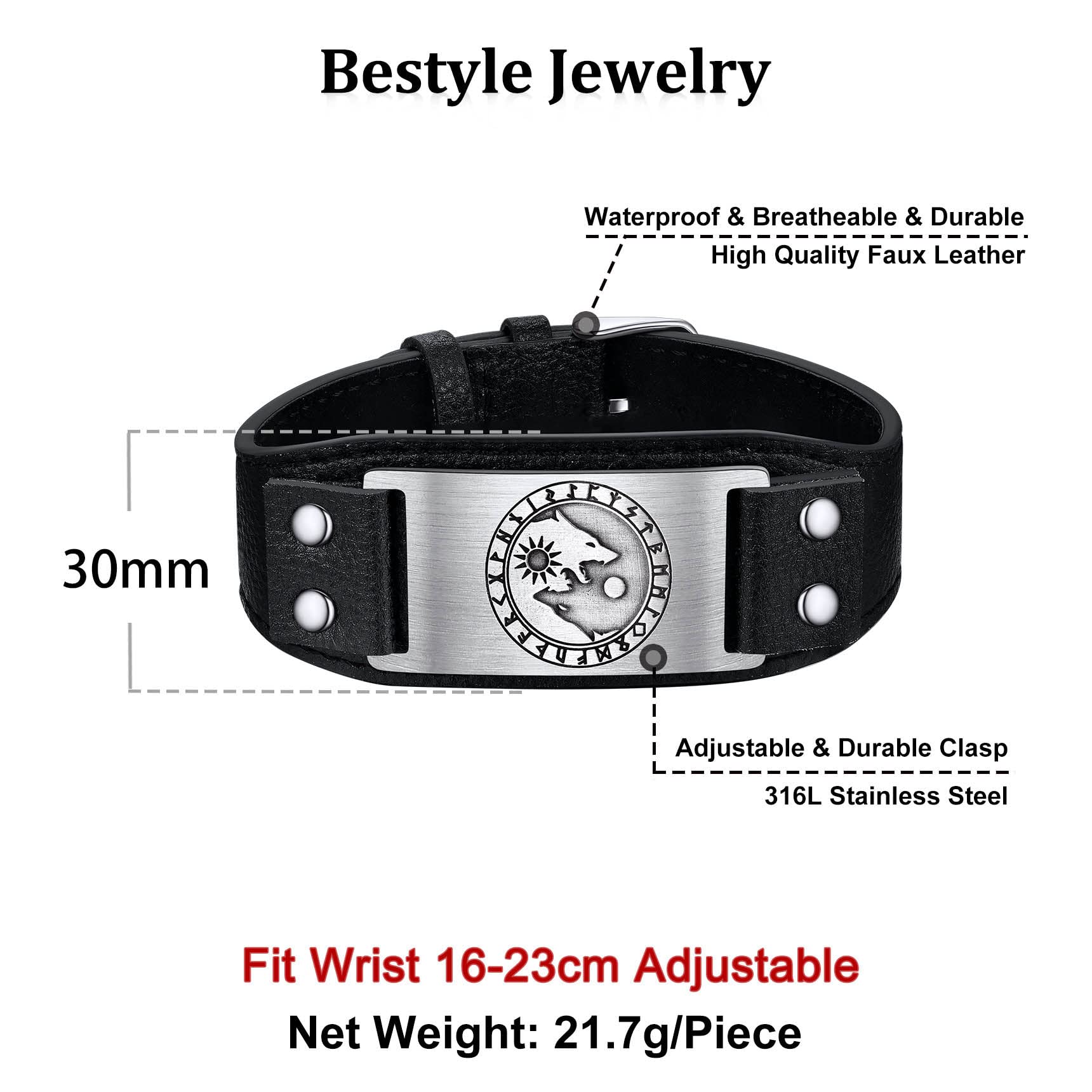 Adjustable Bracelets for Men Boys - 30mm Wide Leather Band, Length can be adjusted from 160mm-230mm(6.3in-9.1in), fit all wrist from boy to big man.