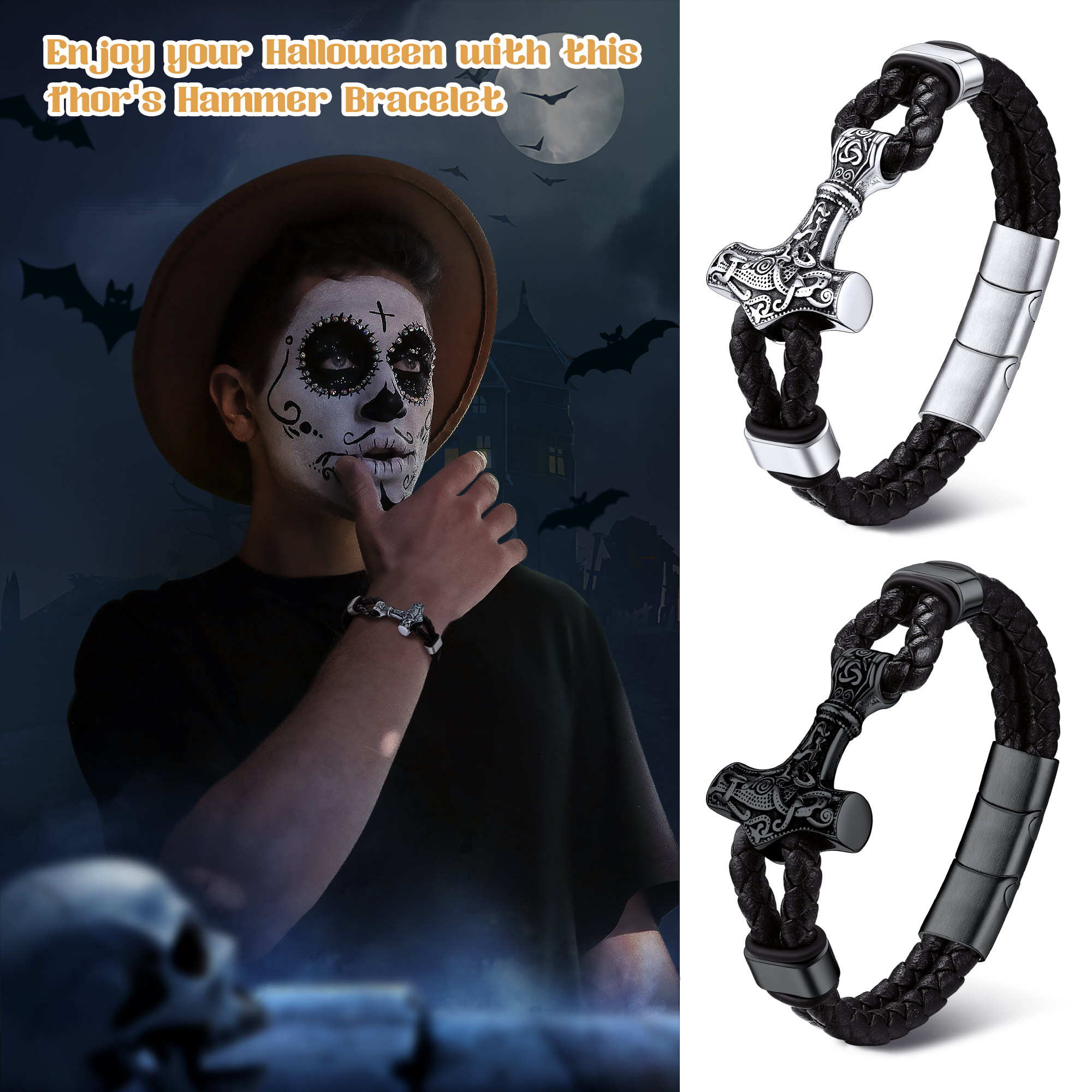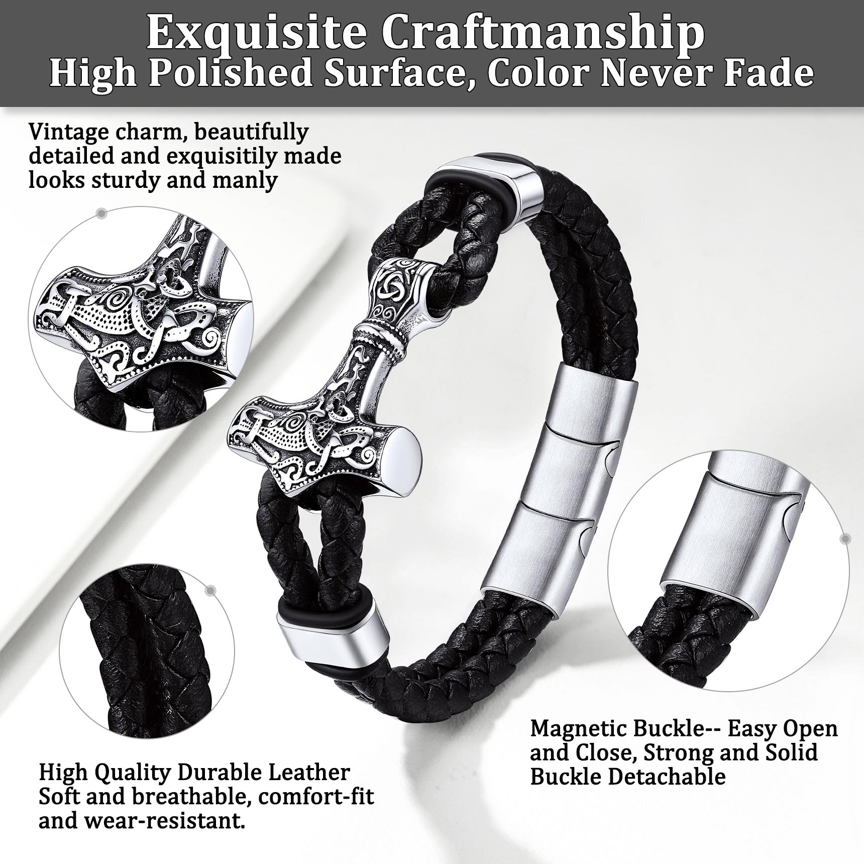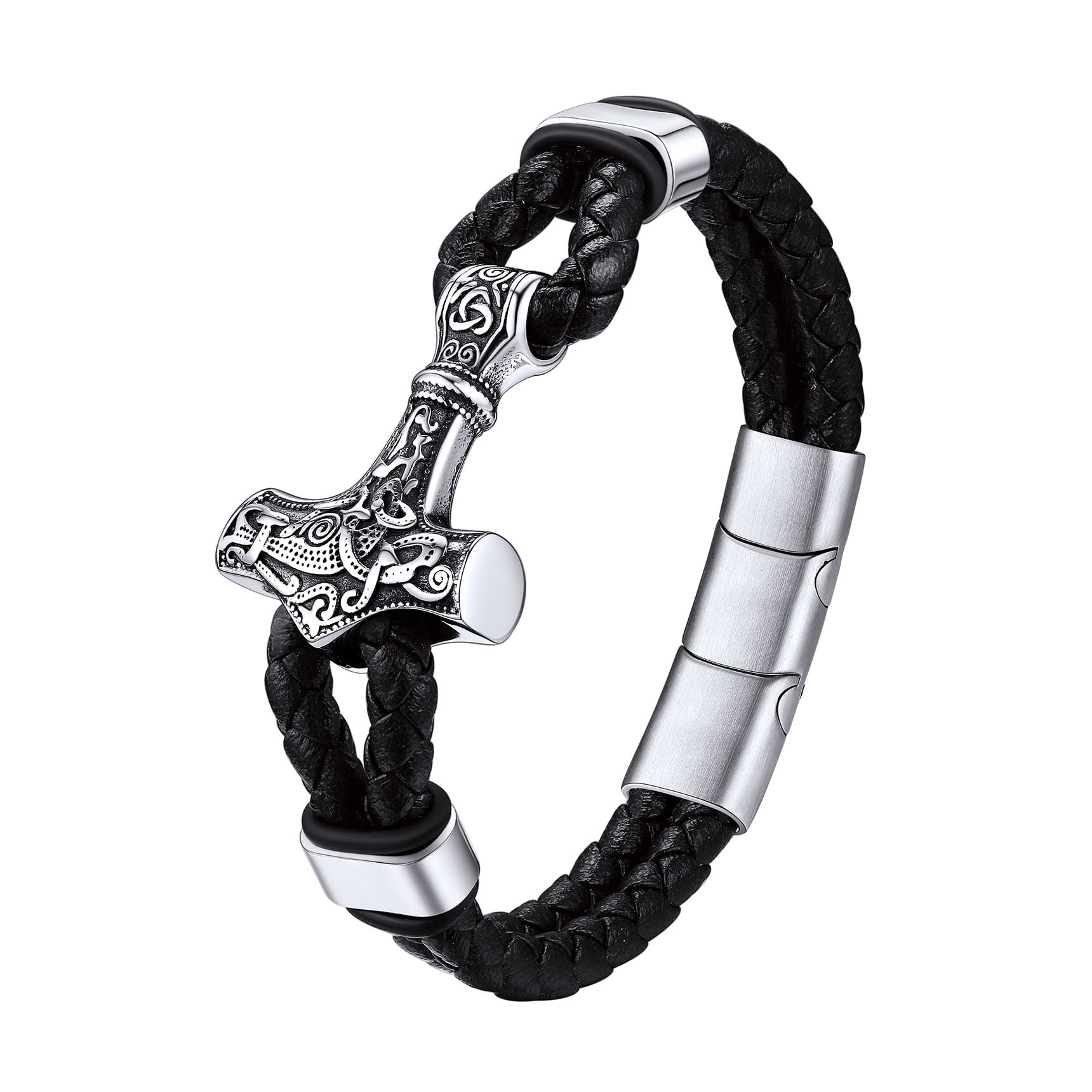 Leather Bracelets for Men - Fine Handcraft, Made of Soft Braided Leather Material and Solid Thick Stainless Steel Thor's Hammer Amulet Charm, Never Out Of Style; Comfortable Wear Feeling, Long Time to Use.