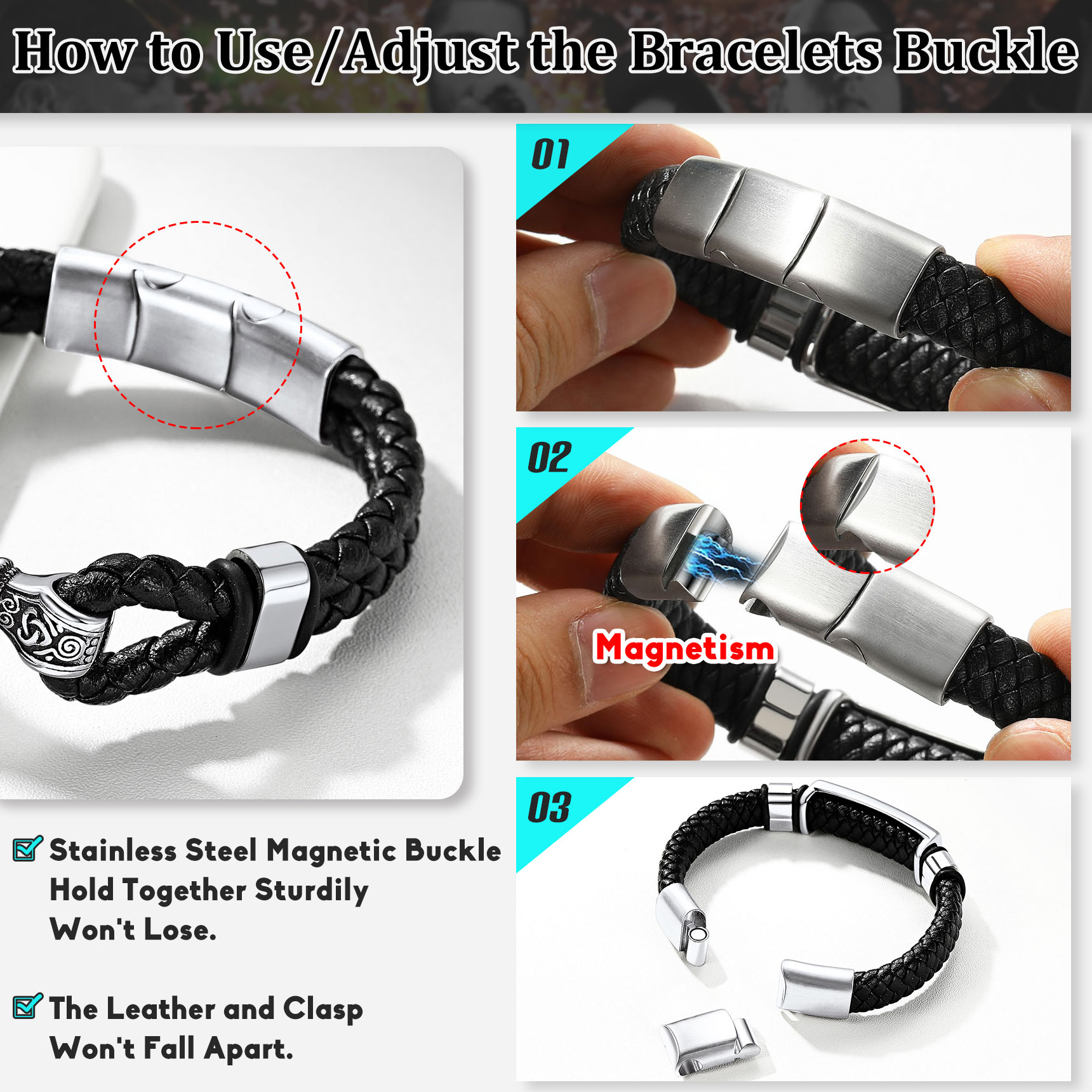 Adjustable Bracelets - 5mm Wide Leather Band, Length 21cm/8.3in, if need shorter band, you could remove an buckle to get a 20cm leather band. Easy to add or remove the buckle with the megnetic clasp.