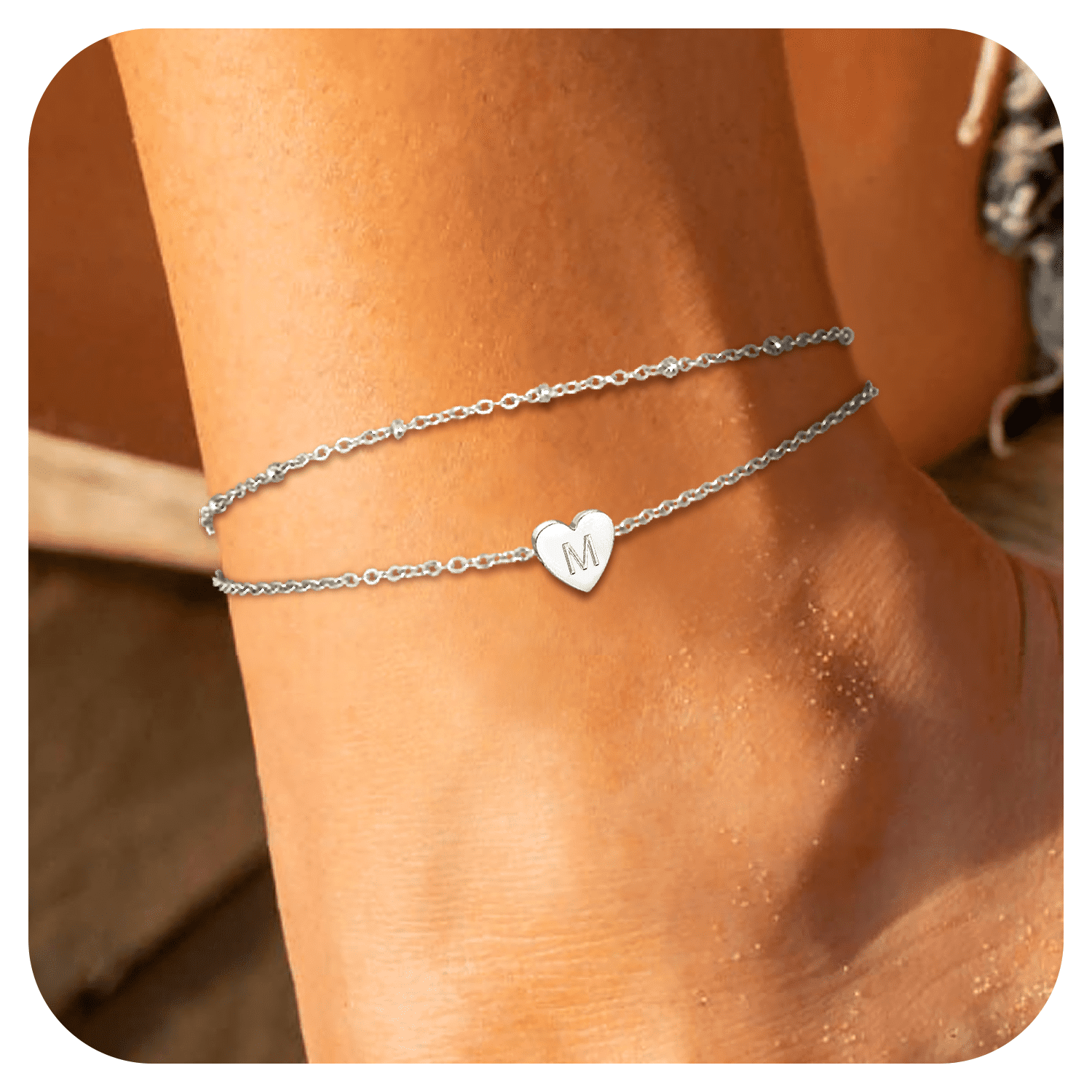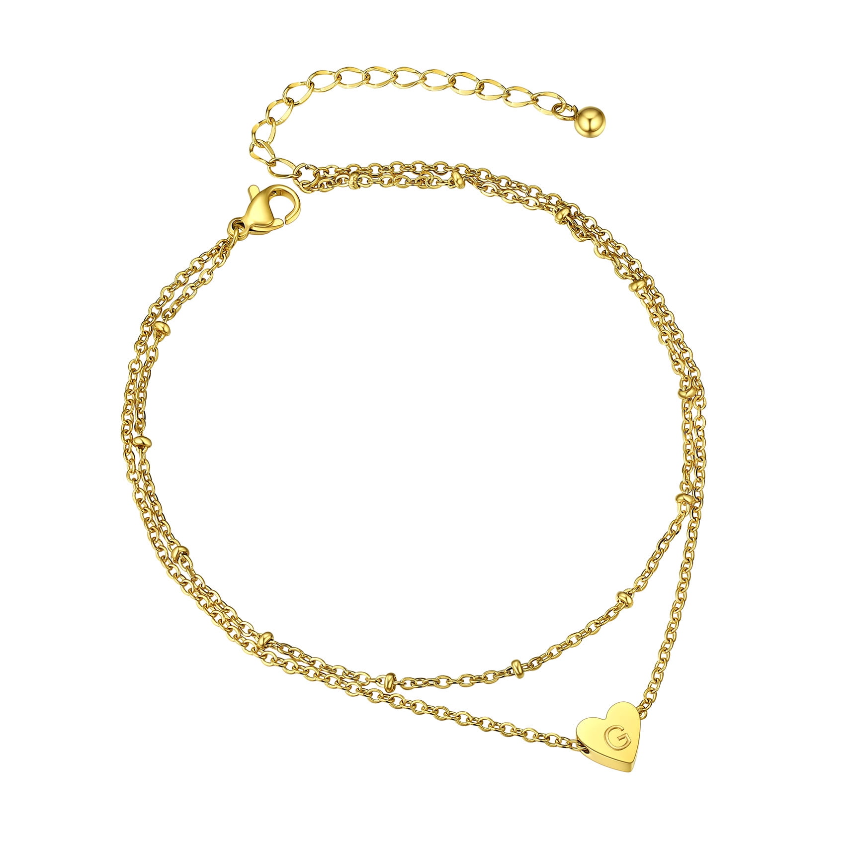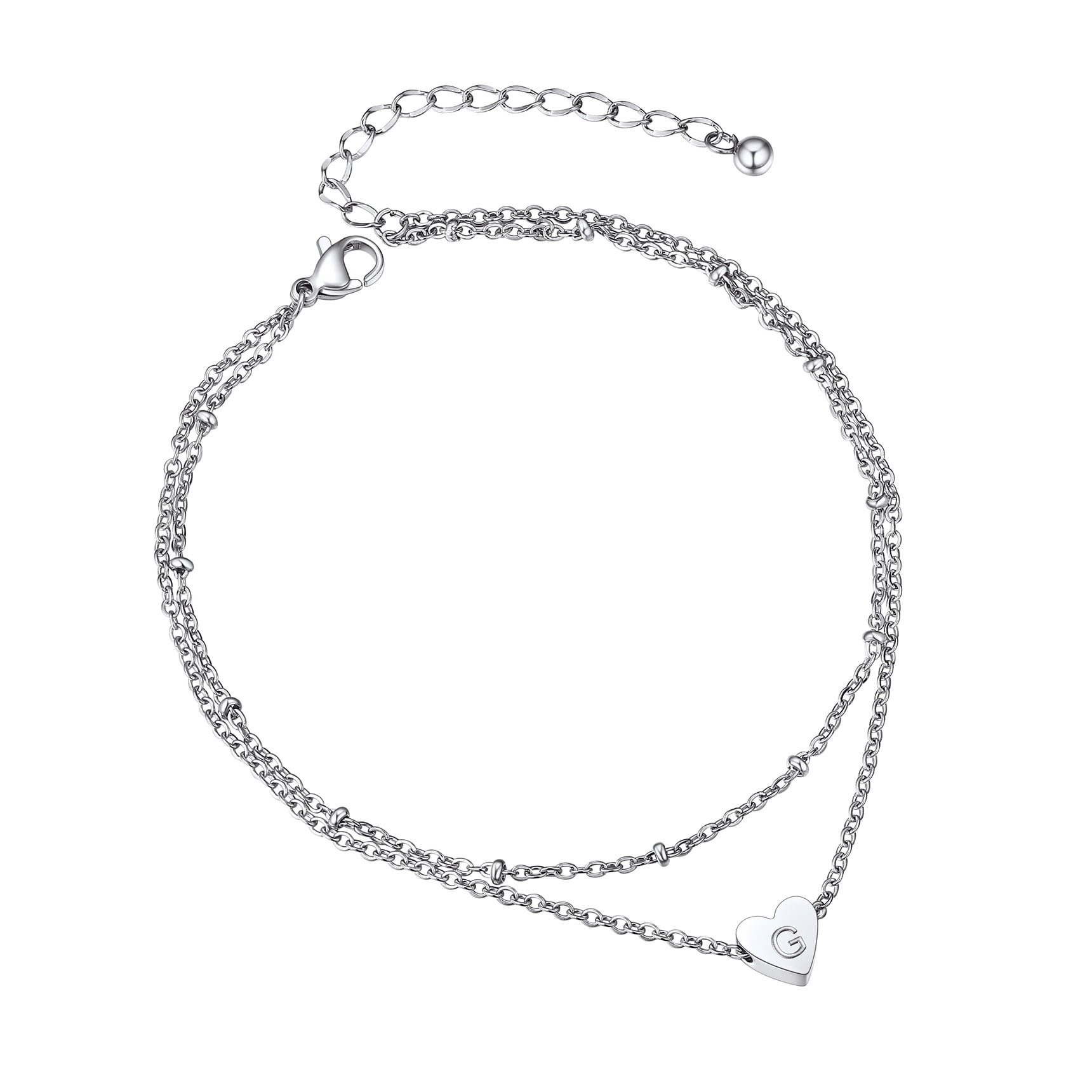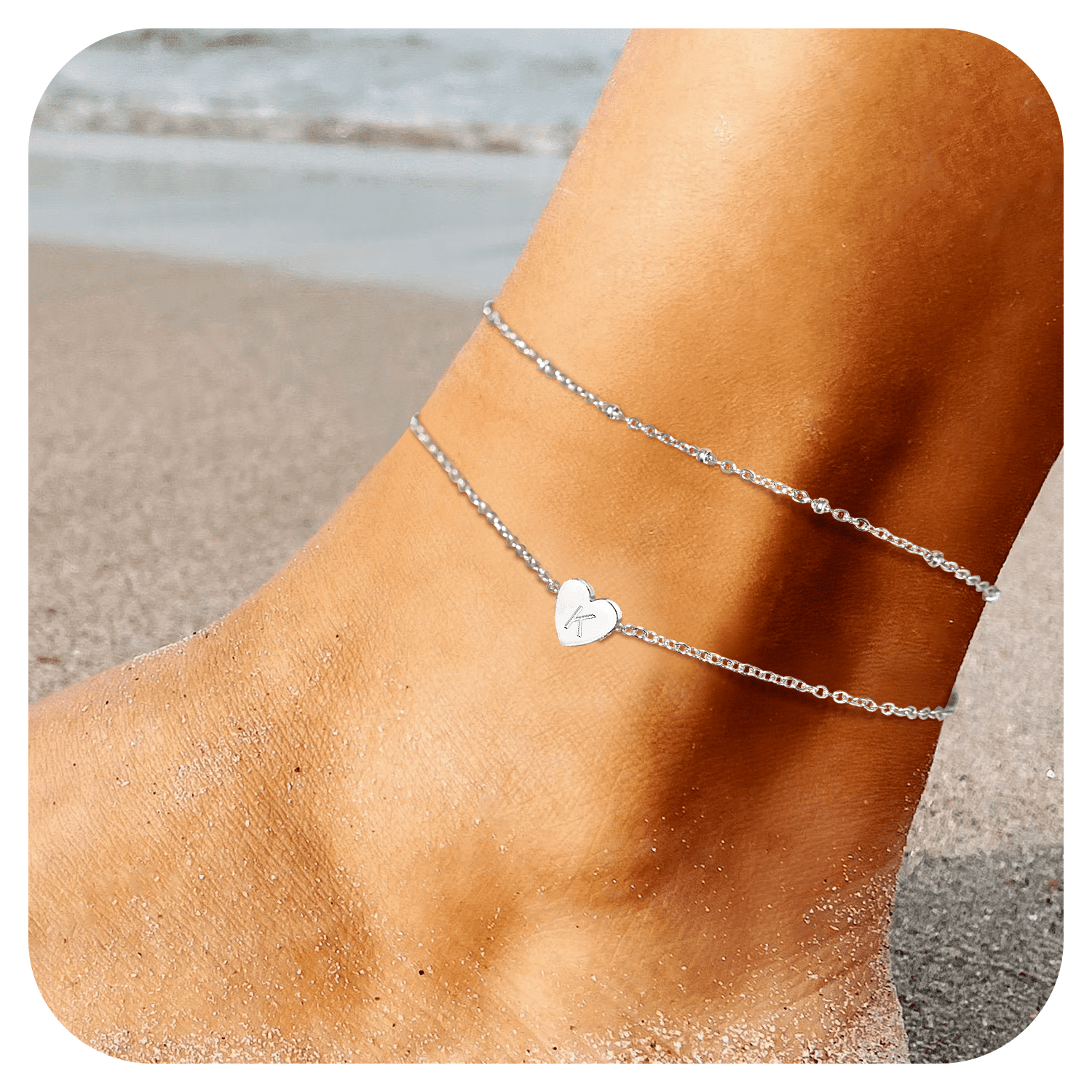 Heart Initial Anklets Bracelet - Our minimal-but-majorly-cool double chain anklet is twice as nice! This layered design features both a delicate rolo chain with heart initial bead and a satellite chain for a simple style that still stands out among all other Plain Anklets.