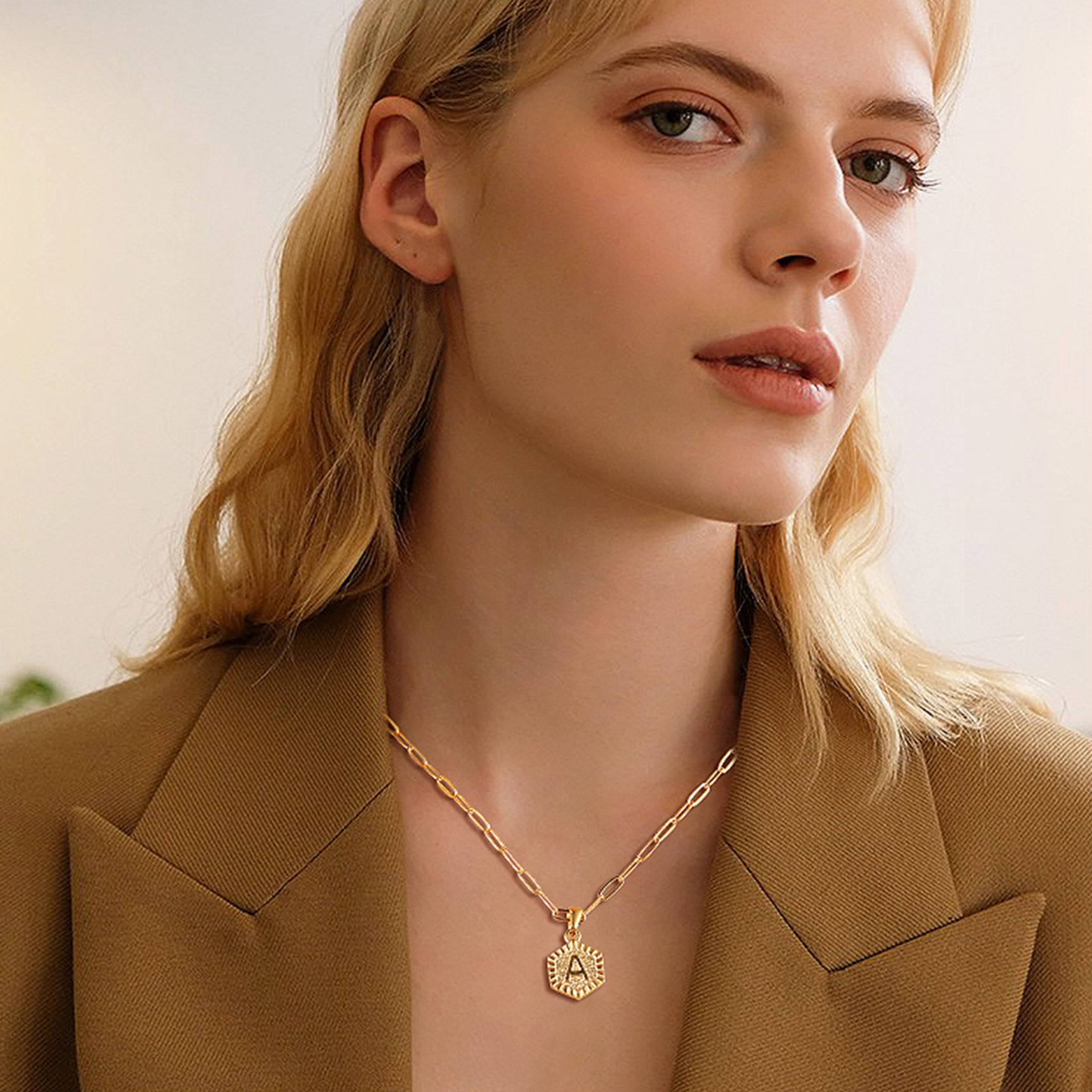 Hexagon Letter Pendant Necklace: Spell it out, this one is for you. Wearing an initial Letter is a classic way to make a statement! The hexagon initial necklace can show off your name and also help your memorize the important ones. Minimalist look can match with other women necklace to layering your style. Keep it for yourself or give as the a statement jewelry gift.