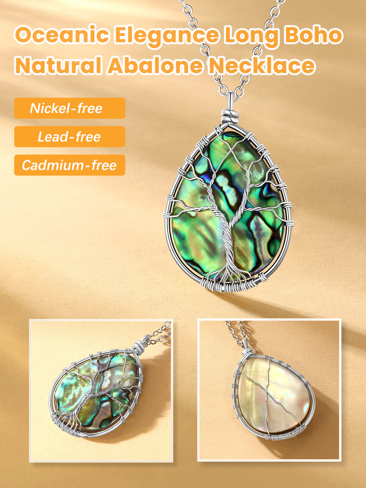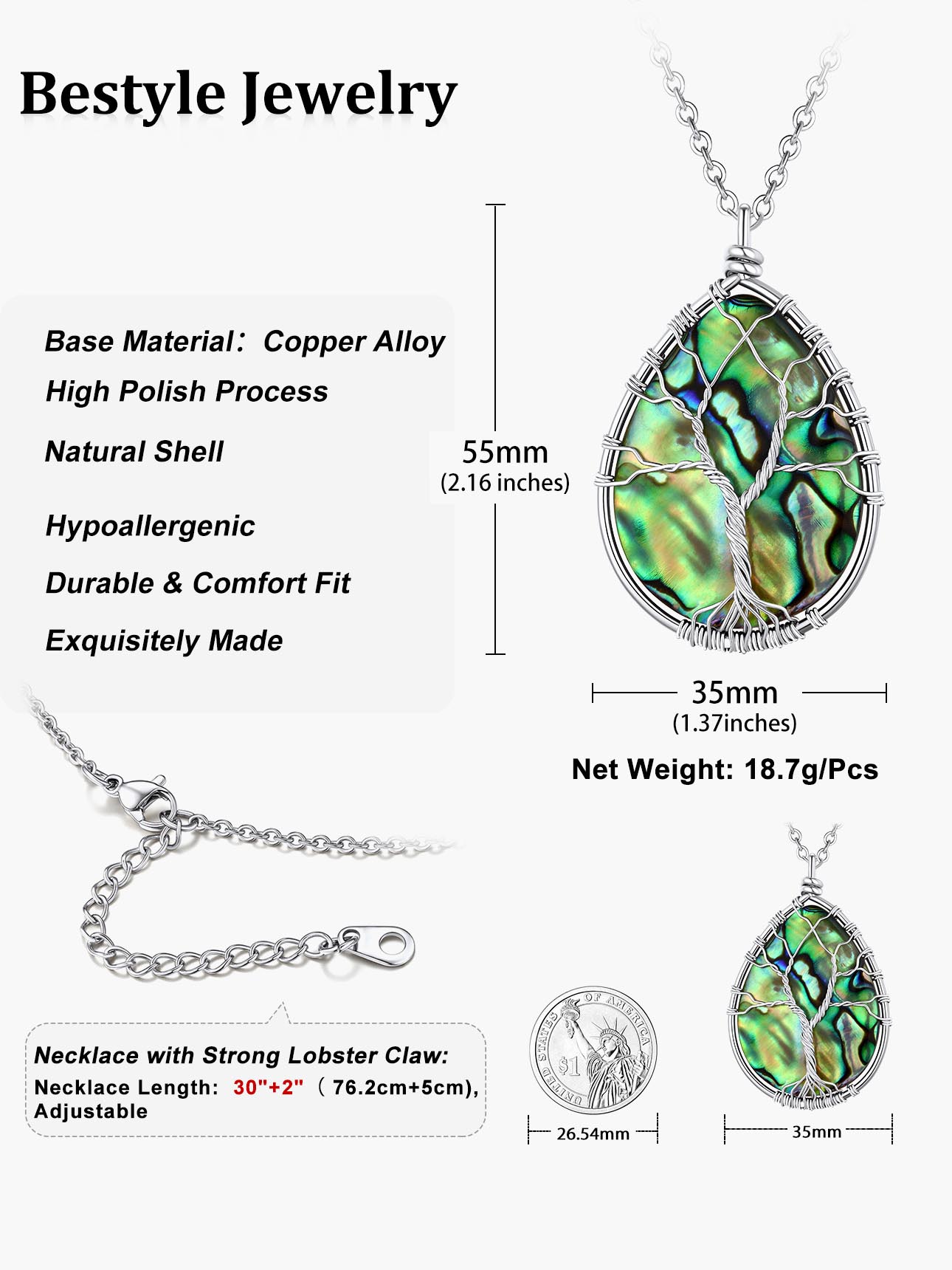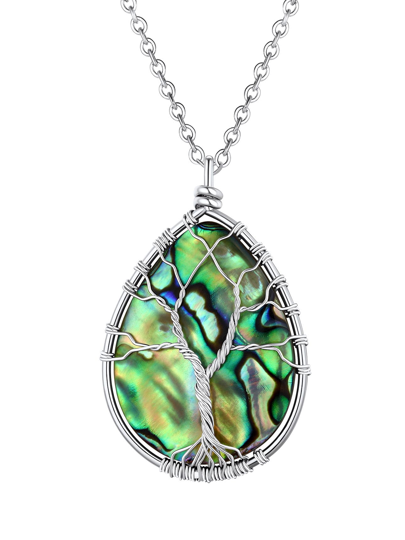 【Handmade Wire Wrapped Healing Necklace】Wrapped with copper wrie, Teardrop Abalone Shell Pendnat Size is 55 x 35mm (2.16" x 1.37"). The long crystal necklace chain is made of copper with white gold plated, length 30+2 inch. Total weigh: 18.7g. If you like short chains, you can put pendant on your own chain. The whole abalone shell necklace is hypoallergenic, nickel and lead free.