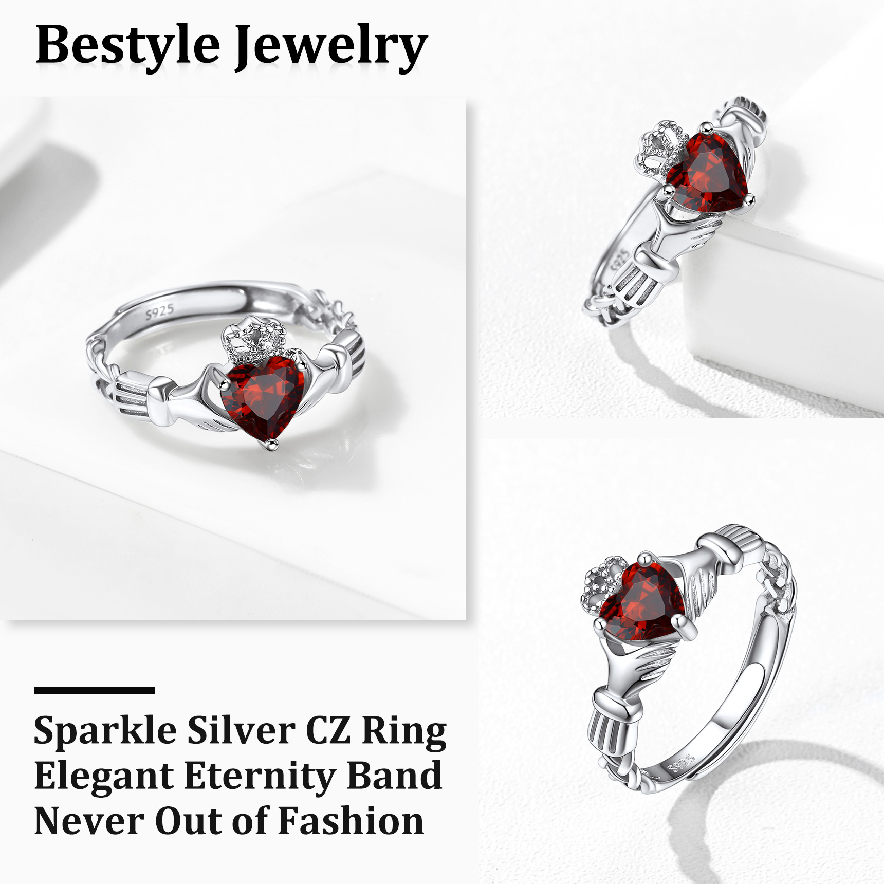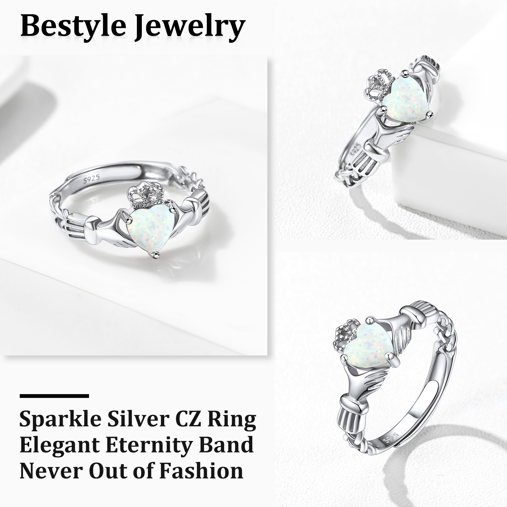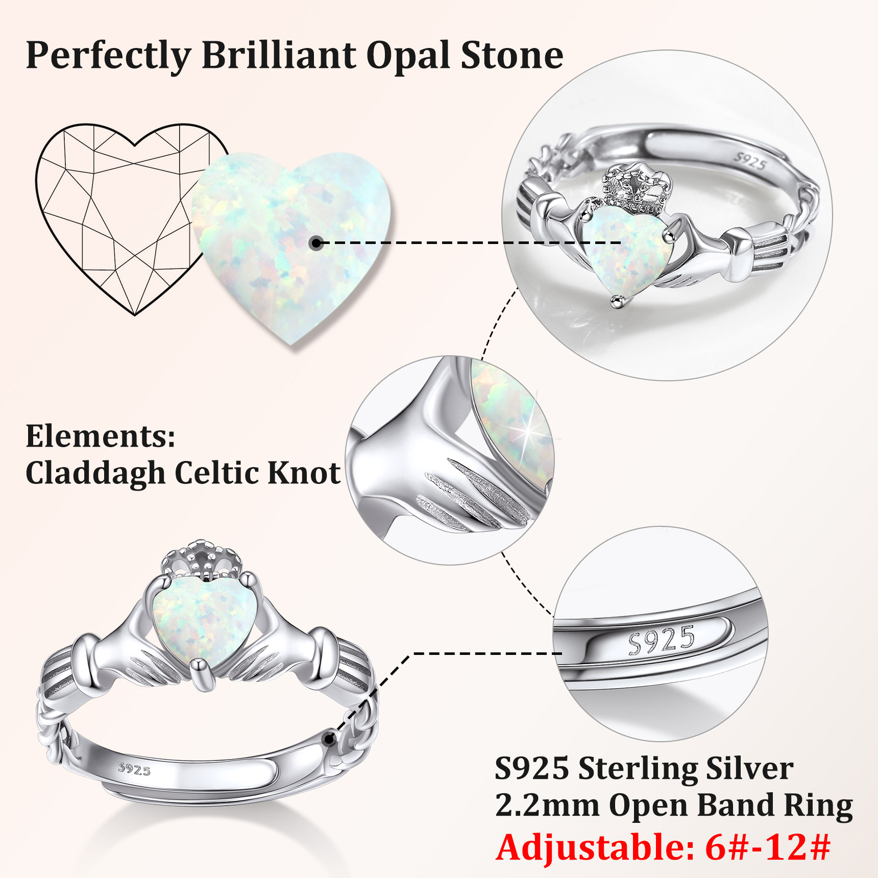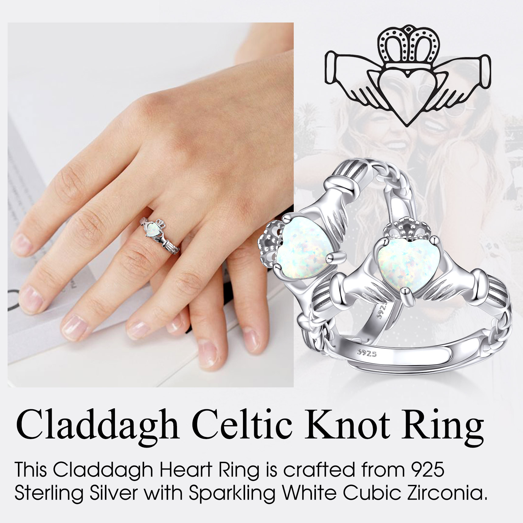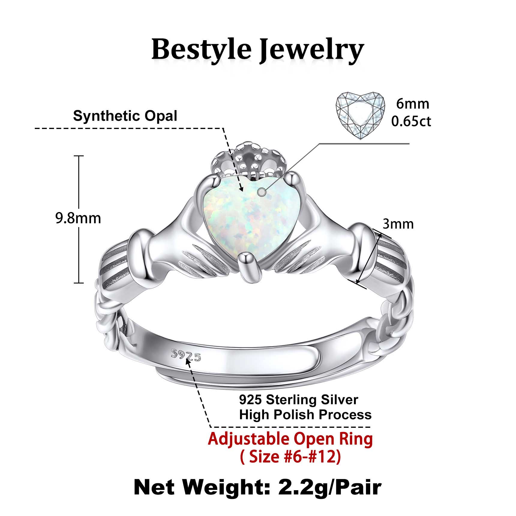 💓💓Adjustable Claddagh Rings for Girls💓💓 This silver opal ring is adjustable, size range from 6 to 12, suit every finger. High polish and light weight, great size comfort for every day wear.
